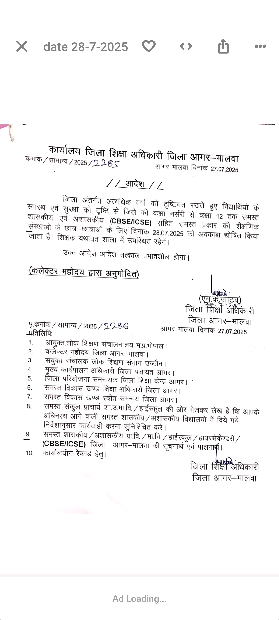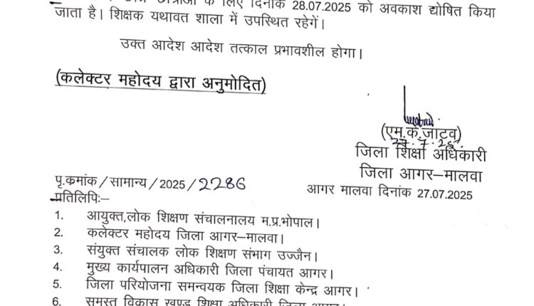 आगर मालवा। जिला शिक्षा कार्यालय से जिला शिक्षा अधिकारी एस. के जाटव ने रविवार देश रात्रि को एक आदेश जारी कर कहा कि लगातार हो रही बारिश को देखते हुए और स्वास्थ्य के ऊपर प्रतिकूल प्रभाव पड़ने को लेकर कक्षा नर्सरी से लेकर 12वीं तक विद्यालय का अवकाश घोषित किया है। आज सोमवार को शासकीय एव अर्द्धशासकीय विद्यालयों मे अवकाश रहेगा। लेकिन शिक्षक विद्यालयों में यथावत उपस्थिति दर्ज कराएंगे।