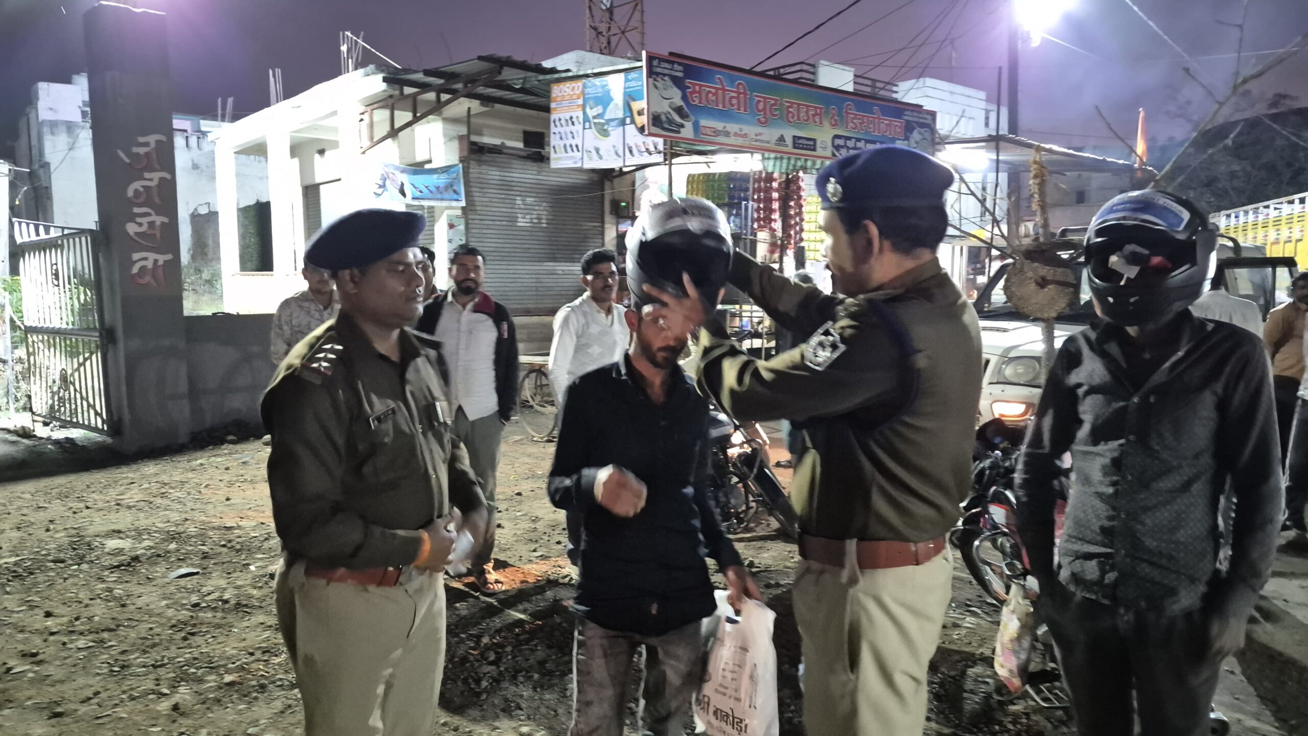 जानकारी दी और हेलमेट पहनने के प्रति जागरूक किया। उन्होंने दो बाइक सवारों को स्वयं अपनी ओर से हेलमेट पहनाकर सुरक्षित यातायात का संदेश दिया। एसपी ने कहा कि यातायात नियमों का पालन प्रत्येक नागरिक की जिम्मेदारी है और हेलमेट जीवन रक्षा का महत्वपूर्ण साधन है।